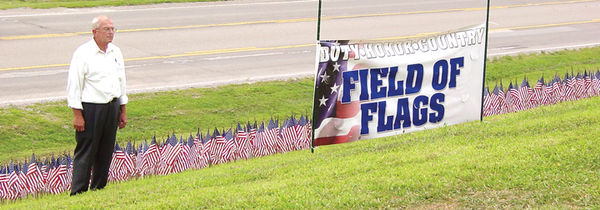 Bill Stuart stands among the Field of Flags awaiting the placement of a flag for Chief Petty Officer Nicholas H. Null.