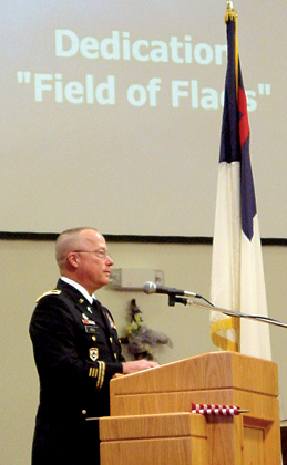 Chaplain (COL) Bruce Reed of the West Virginia National Guard reminded those at the service that each flag represents a face, a family member, a friend. Two were members of his brigade. “They were my friends. . . the faces I still remember,” said Reed.