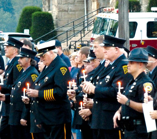 - Emergency personnel of Wetzel County hold their candles as dusk falls over New Martinsville and the 9/11 commemorative event downtown Sunday. (Photo by Miranda Stokes)