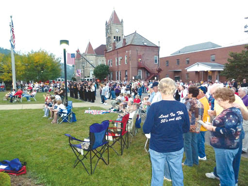 The ceremony began at 7 p.m. with the sounding of 10 fire bells, representing the 10th anniversary of the attacks on that unforgettable day. The crowd, assembled along Washington Street in front of the main entrance to the city building, were led in the singing of the National Anthem by Ryan Ritchea followed by an opening prayer by the Reverend Mike Shank.