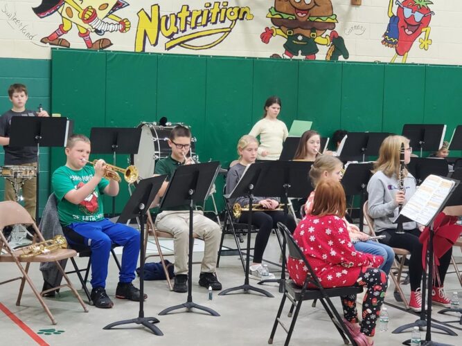 Paden City Elementary 5th and 6th grade band, under the direction of Debra Price, performed their annual Christmas Concert on December 12th. The concert began with a traditional rendition of Rolling Along, followed by Up on the Housetop, then Hot Cross Buns. Maddie Householder, Kolby Grimes and Holden Amos were featured as a brass trio playing Twinkling Fours. Students then entertained their families and friends with Jolly Old St. Nicholas, Lightly Row, and Ode to Joy. 5ht and 6th Percussion was the focus for Carol of the Bells with some glowing sticks and 5-gallonbuckets. The concert concluded with Ye Merry Gents and Jingle Bells. Thank you all for working so hard to share a little Christmas Spirit!