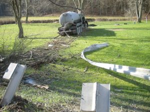 The most recent accident at the intersection of Brock Ridge and state Route 7 took place around 10 a.m. Saturday. It is speculated the driver lost control of the vehicle coming down the ridge due to possibly not gearing down to safely descend the 18 percent grade down to the intersection. The truck crossed state Route 7, ran through the guard rail, tore off a utility pole, veered off a tree, then continued for approximately 70 feet into the side yard of Genine and Ed Van Horn, finally stopping as the truck hit another tree head-on.