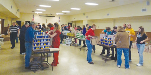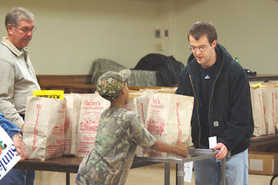 Volunteers of all ages work together to load bags filled with all the holiday meal trimmings for needy families in Wetzel County.