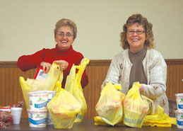 - Volunteers Myrtle Heck and Judy Pastilong assemble bags of butter and rolls to accompany the holiday meal items collected for the Esther Crumbley Food Drive.