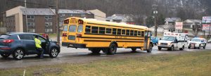 BY?AMY?WITSCHEY Editor Thankfully a motor vehicle accident on state Route 2 in Steelton Tuesday afternoon involving a bus was not a major incident. New Martinsville Police Chief Tim Cecil said four of the 27 elementary school students on the bus were taken to area hospitals, but none of their injuries appeared to be significant. One child was transferred to Wetzel County Hospital and the other three were deferred to Sistersville General Hospital as the CT scanner at WCH was temporarily out of order. The accident happened at 3:13 p.m. when a Pennsylvania woman driving a Kia Sportage south on state Route 2 just south of Captain’s Quarters restaurant failed to stop for traffic and hit the back of Wetzel County Schools Bus 31. She was cited for failure to maintain control but her name is not being released at this time. Cecil said the front end of the car sustained damages, but the bus was rather unscathed. The bus was almost to its destination, The Villa apartments, where all of the children were to exit the bus. So the waiting parents all came to the accident site where officials signed each kid out to their parents or guardians. School Superintendent Diane Watt was at the scene and helped get the kids off of the bus. Also assisting at the scene were Cecil, NMPD Sgt. Steve Kastigar, Paden City Police Department, Wetzel County Sheriff’s Department, New Martinsville Volunteer Fire Department, and four area Emergency Medical Squads.