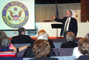 Congressman David McKinley, right, speaks at a town hall meeting held in New Martinsville on?Feb. 24. (Photo by Amy Witschey)