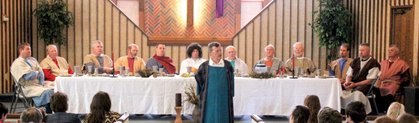 Pictured is First Church of God Pastor Russ Whitener, front, speaking about the Last Supper at the church’s Palm Sunday service. Various men from the church can be seen acting as participants in the Last Supper.