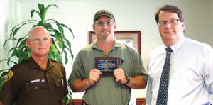 Corporal Kevin Goff, center, accepts the Law Enforcement Officer of the Year award from Wetzel County Prosecutor Timothy Haught, right. Pictured at left is Goff’s supervisor, Sgt. C.D. Shriner. (Photo by Amy Witschey)