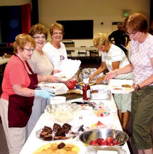 Several women fill takeout containers with meals at the New Martinsville United Methodist Church. Pastor Melissa Shortridge is on the right. The church served as a cooling center and shelter, as well as served three meals a day, since Thursday. (Photo by Amy?Witschey)