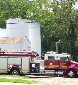 The New Martinsville Volunteer Fire Department responds to a leaking valve at an 11,000 gallon gasoline tank at Tri-State Petroleum Tuesday. (Photo by Amy?Witschey)