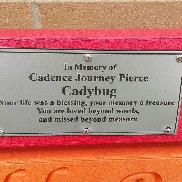 A plaque, on the bench, reads “In Memory of Cadence Journey Pierce, Cadybug.”
