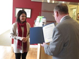 Photo by Telina Frye Dr. Anissa Anderson stands as Delegate Dave Pethtel reads a special legislative citation, recognizing and congratulating Anderson for being a distinguished alumnus of West Liberty University.