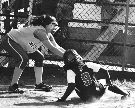 Pitcher Emily Ebert slides in safe under the tag at home.