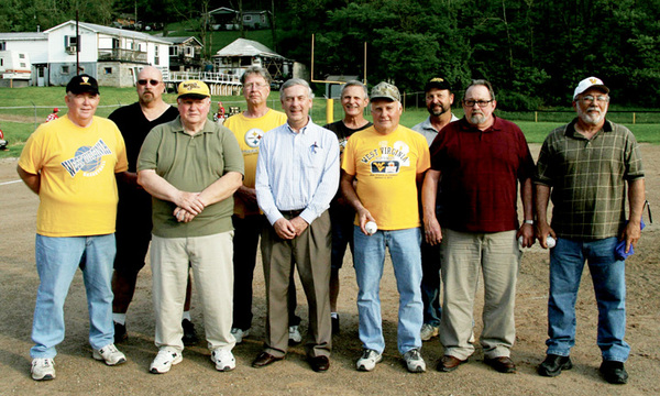 Valley High School dedicated its new athletic field May 4 between games in a double-header with Tygarts Valley. Nine of the 10 members of the school’s first baseball team (1966) were present to throw out the ceremonial “first ball,” greet members of the present baseball squad, and reminisce about the game. It was the first time they had all been together at the same place and time since they graduated.