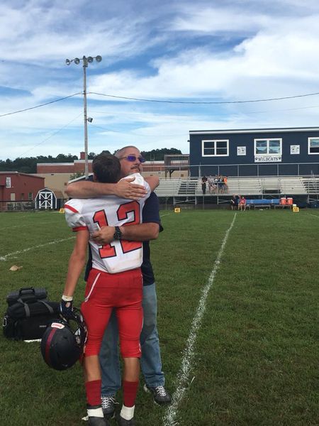 Photo by Tina McBee Martin Baker (12) and his dad Shannon, the Hundred Hornets’ team trainer, celebrate the team’s first win in 50 games, a 42-26 thumping of Hannan.
